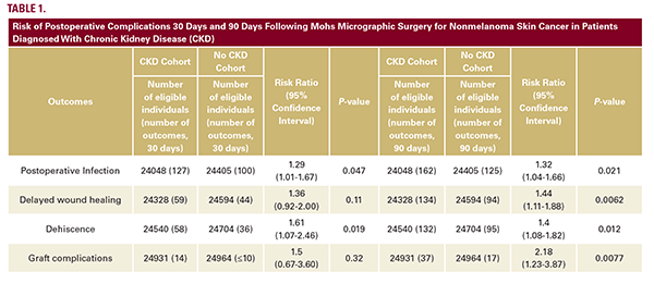 Chronic kidney disease (CKD) affects approximately 14% of adults nationally and is characterized by impaired immunity, systemic inflammation, and microvascular dysfunction.1,2 These physiologic disruptions impair wound healing and predispose patients to adverse surgical outcomes.1,2 Mohs micrographic surgery (MMS) is the gold standard for managing nonmelanoma skin cancer (NMSC), offering high cure rates while preserving healthy tissue.3 Given that MMS is frequently performed in medically complex patients,3 including those with CKD, understanding the postoperative risks in this population is critical. While CKD has been broadly linked to poor surgical outcomes,2 limited data exist on its impact on complication rates following MMS.