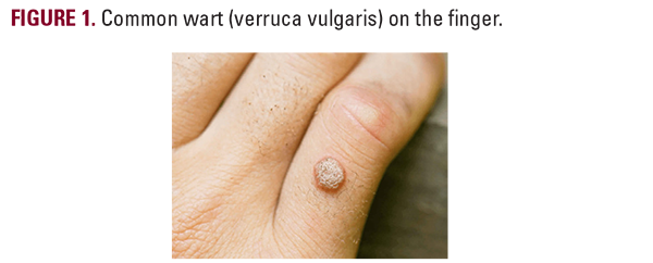 Warts are papillomas arising from HPV infection of epidermal or mucosal cells. Histologically, warts demonstrate epidermal hyperplasia, parakeratosis, koilocytosis, and papillomatosis. Reasons for treatment include pain, functional impairment, transmission risk, and cosmetic embarrassment.18 Presenting patients may represent an infected population, so measures inhibiting spread, such as socks covering affected feet, are beneficial.4 There are several types of skin/cutaneous and submucosal warts. Cutaneous warts can be further subdivided. Verruca vulgaris (Figure 1), or common warts, often appear as hyperkeratotic papules and plaques.4 Plantar warts (Figures 2, 5)