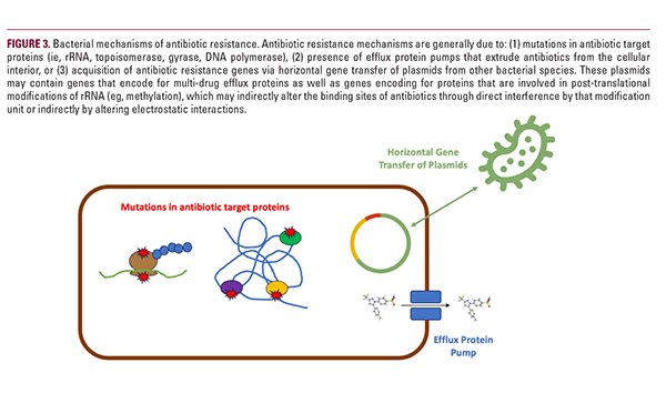 Efflux protein pumps are another mechanism of resistance where bacteria pump out antibiotics from the cellular interior to the exterior.50,51 Notably, efflux pumps can selectively extrude a distinct class of antibiotics or can pump out several classes leading to multi-drug resistant bacteria.52 Genes encoding efflux protein pumps could be intrinsic to the bacteria or acquired through horizontal gene transfer from other bacteria.53