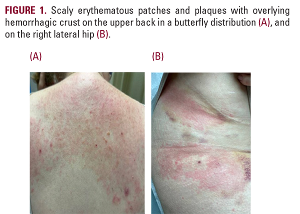 A 66-year-old woman with vulvar lichen sclerosis, Raynaud's phenomenon, and biliary colic status-post cholecystectomy presented for an intensely pruritic rash ongoing for several months. The eruption affected her right ankle, upper back, extensor elbows, and suprapubic area (Figure 1). She also reported mild gastrointestinal reflux. Prior to dermatology evaluation, she completed 3 prednisone courses, with persistent or recurrent symptoms. Topical steroids, antihistamines, and empiric scabies treatments were also ineffective. Family history included renal cell carcinoma (father) and bullous pemphigoid (mother).