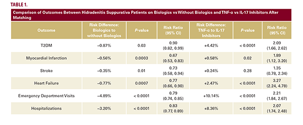Out of 291,283 patients with HS, 11,669 patients were treated with biologics and 104,076 were not. In the biologic group compared to no biologic use, the mean age was 37.1 vs 36.9 years, respectively, both with over 70% female predominance. 11,669 patients were matched in each cohort. Patients receiving biologic therapy had a significantly (P<0.05) lower risk of developing T2DM, myocardial infarction, stroke, and heart failure compared to matched HS patients not treated with biologics. ED visits and hospitalizations were also reduced. When comparing biologic classes, 10,294 patients were treated with adalimumab (TNF-α inhibitor) and 3,336 with secukinumab or bimekizumab (IL-17 inhibitors). In the TNF-α group compared with IL-17 inhibitors, the mean age was 36.7 vs 39.0 years, respectively, both with over 70% female predominance. 3,336 patients were matched in each cohort. HS patients treated with IL-17 inhibitors had a significantly (P<0.05) lower risk of developing T2DM, myocardial infarction, and heart failure, compared to patients on TNF-α inhibitors. ED visits and hospitalizations were also reduced in the IL-17 inhibitor cohort (Table 1).