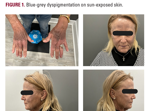 A 70-year-old female presented to our clinic with a one-year history of diffuse blue-grey hyperpigmentation in a photodistributed pattern on the face, hands, and dorsal forearms (Figure 1).