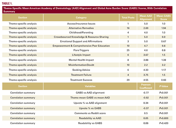 The authors conducted a cross-sectional analysis of the top posts from the r/eczema subreddit between May 25, 2024, and May 25, 2025. Of 210 posts screened, 123 met the inclusion criteria (English language, relevant to AD diagnosis; excluding off-topic and spam posts). Posts were thematically coded and scored using two frameworks: (1) a Guideline Alignment and Bias Scoring (GABS; a score from 0–5, a higher score indicated greater misinformation/bias. Criteria assessed included; testability, credibility, AAD contradiction, pseudoscientific claim, and basis of claim), and (2) AAD alignment (A score from 1–5, a higher score representing stronger guideline concordance).5 Two independent raters scored posts; inter-rater reliability was high (κ = 0.81). Readability was assessed with the Flesch–Kincaid index. Pearson correlations evaluated associations among GABS, AAD alignment, engagement, and readability.