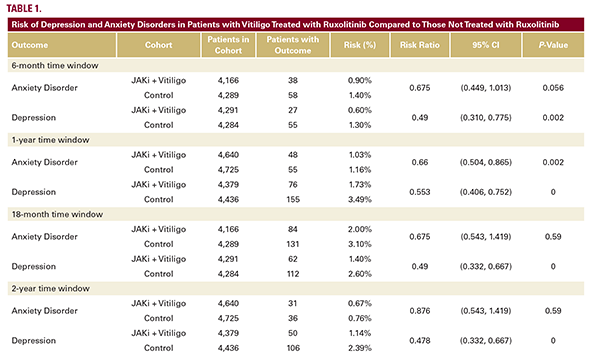 In this retrospective cohort study, we used the TriNetX Network to examine rates of depression and anxiety in vitiligo patients treated with ruxolitinib. The TriNetX Network allows examination of claims and electronic health record data for patients from 24 US healthcare organizations. This type of claims-level analysis offers, among its advantages, the ability to evaluate large numbers of patients, to associate different clinical states in each patient (via ICD codes), and to evaluate interventions via pharmacy claims data.