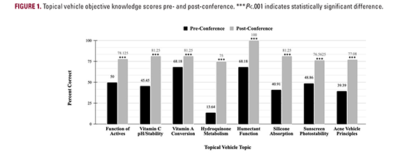 Participants completed pre- and post-conference surveys assessing prior exposure to TV education, comfort discussing TV formulations, confidence recommending OTC products based on TV type, and formulation knowledge. Objective questions evaluated resident knowledge of actives, vitamin C, vitamin A derivatives, hydroquinone, humectants, silicones, sunscreen, and acne topicals. Pre- and post-intervention objective knowledge scores were compared using a paired-samples t-test in SPSS version 31 (α=.05).