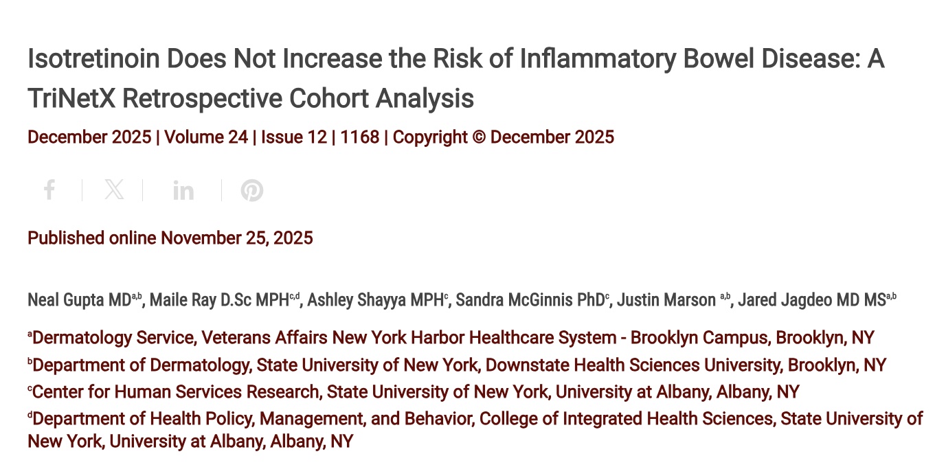 Isotretinoin and IBD — large real‑world data offer reassurance In one of our recent JDD articles, a retrospective cohort using the TriNetX network compared acne patients exposed to long‑term, low‑dose...