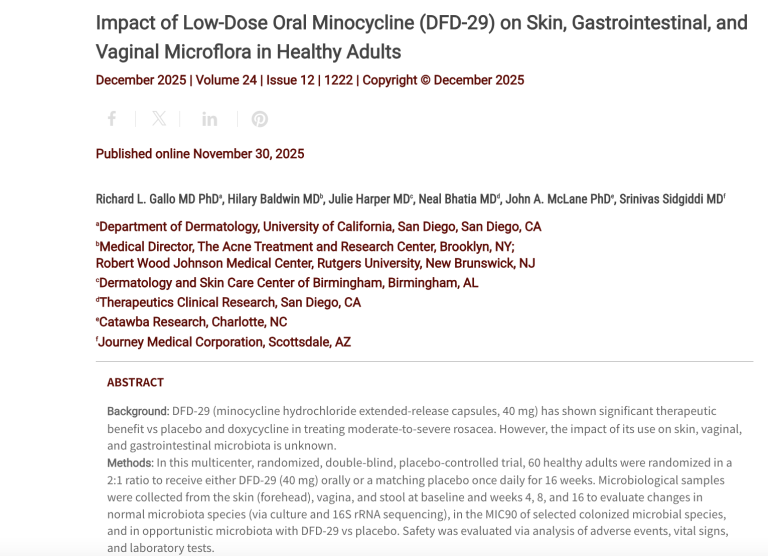 In the December issue of JDD we wanted to highlight a randomized, double‑blind, placebo‑controlled microbiome study of DFD‑29 (minocycline hydrochloride extended‑release 40 mg) given once daily for 16 weeks. Sixty healthy adults (2:1 randomization) had microbiologic sampling from forehead skin, stool and vagina at baseline and weeks 4, 8 and 16.